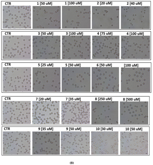 Echinocytes are formed when the agents that preferentially accumulate in the outer layer of the RBC membrane bilayer expand it, thus giving the cell an echinocytic shape []. In most samples, the population of echinocytes exceeded 80% of the total erythrocytes observed in the microscopic field of view. Incubation of erythrocytes with compound 1 led to the extensive formation of echinocytes and anisocytes, while compound 2 resulted mainly in echinocytosis. In addition, echinocytes accounted for the major part of erythrocytes following treatment with compounds 3 and 4 at a concentration of 100 µmol/L, and for compounds 5 and 6, as well as 9 and 10. Compound 7 primarily led to echinocytosis, however single anisocytes could also be detected. In summary, in vitro exposure of RBCs to different concentrations of examined compounds and reference molecules resulted mostly in the formation of echinocytes. Nevertheless, the process of transformation of biconcave erythrocyte to echinocyte occurs naturally in blood vessels, and results from the insertion of xenobiotics into the outer monolayer of the erythrocyte membrane. As this is a reversible process [] caused by a series of chemical and physical factors including increased ion strength, alkaline pH and decreased ATP level, it may be assumed that most of the analyzed compounds do not affect RBCs in a pathological manner at the relevant concentrations.