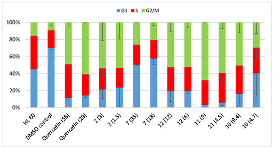 The effect of the test compounds and quercetin on the cell cycle in HL-60 cells. Cell cycle distribution of HL-60 cells after treatment with the test compounds. The concentrations of the compounds (in µM) are given in the parenthesis and correspond to 1× IC50 and 0.5 × IC50 (µM). 1% DMSO was used as the vehicle control. Bars represent mean values from two independent experiments.