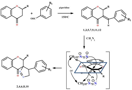 Following on from a previous paper [], the present study broadens our studies of the reactivity of 3-arylideneflavanones and 3-arylidenechromanone with diazomethane on a larger number of compounds containing various benzylidene substituents. The formation of spiro- compounds as a result of attack by a nucleophilic reagent on the carbon of the 3-arylideneflavanone most probably depends on the degree of electropositivity of the carbon; this would govern reactions with the various resonance structures of diazomethane []. It is possible that the resonance structure of diazomethane, with a partial negative charge on the carbon atom, may be attacked in the reaction of the formation of 3-spiropyrazolines (Scheme 1).