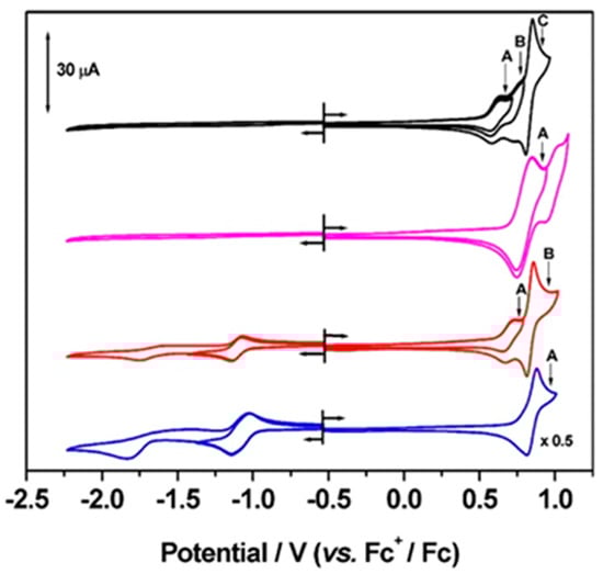 Cyclic voltammetry of P5A (black trace), [P5A-Rot]2+ (magenta trace), P4A1Q (red trace) and P3A2Q (blue trace), in CH2Cl2 containing [nBu4N][BF4] (0.4 M) as supporting electrolyte, at ambient temperature and at 0.10 Vs−1. Letters indicate potentials applied in bulk electrolysis and spectroelectrochemical experiments; first oxidation (A), second oxidation (B) and third oxidation (C).