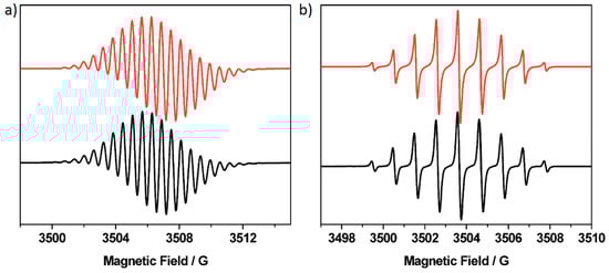 Experimental (black) and simulated (red) X-band EPR spectra of: (a) [P5A]+ and (b) [P4A1Q]−. Samples were electrogenerated from the parent molecules at 273 K as CH2Cl2 solutions containing [nBu4N][BF4] (0.4 M) as the supporting electrolyte. Spectra were recorded at ambient temperature. Simulated spectra were generated using the parameters listed in Table 3.