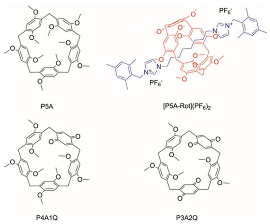 - Yang, K.; Chao, S.; Zhang, F.; Pei, Y.; Pei, Z. Recent advances in the development of rotaxanes and pseudorotaxanes based on pillar[n]arenes: From construction to application. Chem. Commun. 2019, 55, 13198–13210. [Google Scholar] [CrossRef]