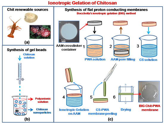Chitosan renewable sources (a); Scheme of ionotropic gelation of chitosan through cross-linking for the formation of (b) gel beads; (c) proton conducting flat structures (BIG method).