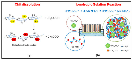 Figure 1b shows the experimental procedure followed to synthesize flat proton-conducting Chit/PWA structures by ionotropic gelation (BIG process). Commercial AAM was used as a porous matrix containing the crosslinker solution. Chit was solubilized in distilled water and acetic acid (1% v/v) to achieve concentrations of 1, 2, and 3% wt/v. The solution is stirred for at least 24 h before use and then filtered to remove impurities. Highly concentrated PWA aqueous solution (0.76 M), containing only (PW12O40)3− anions [66] was used as a crosslinker solution.