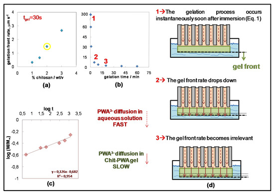 Gelation front rate as a function of (a) chitosan concentration; and (b) gelation time at 2% wt/v Chit. (c) Curves of versus log(t) for Chit-PWA composite structures at 2% wt/v Chit. The linear equation can be applied only for log(Mt/M∞) ≤ 0.22. (d) Scheme illustrating the growth steps of Chit/PWA composite flat structures over the AAM crosslinker-container (step 4 in Figure 1c)