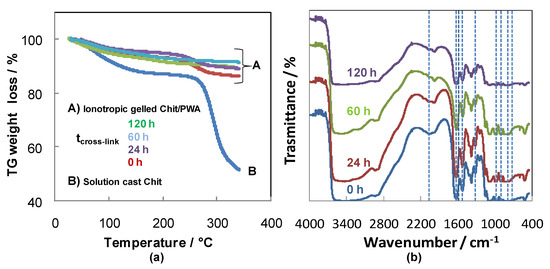 (a) TG under N2 atmosphere and (b) FTIR analysis of composite Chit/PWA flat structures prepared according to the BIG method at 1% wt/v Chit and different post crosslinking times.