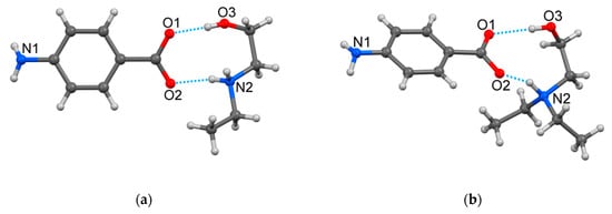 The analysis of both crystal structures revealed the formation of 1:1 organic salts HEEA-pABA and HDEEA-pABA with proton transfer from carboxylic group of pABAH to nitrogen atoms of alkanolamine molecules (Figure 1). The (pABA)‒ anion formed non-planar system in HEEA-pABA and a practically planar system in HDEEA-pABA, since the dihedral angle between the least squares plane of the phenyl ring C6 and the COO‒ group was equal to 20.1° and 5.6°, respectively.