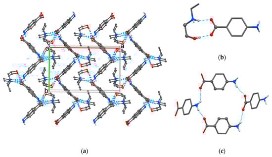 Thus, benzoic acids, well-known for their importance as building blocks in drug development, gained increasing attention in plant science, being involved in various physiological processes from the regulation of seed germination [5,6,7] to disease resistance and stress tolerance in plants [8,9]. Among these compounds, p-aminobenzoic acid (pABAH) is a well-known natural metabolite present in plant and animal tissues, widely described in literature as a precursor of folic acid [10] and recently of coenzyme Q [11]. It possesses numerous biological activities in medicine such as antioxidant [12], antibacterial [13], antimutagenic [14], anticoagulant [15], fibrinolytic and immunomodulating agent [16], protective drug against UV-irradiation [17] and also in agriculture as a chemical inducer associated with thermotolerance [18] and pathogens resistance [19] in plants. Moreover, an examination of the Cambridge Structural Database (CSD) has confirmed the pABAH versatility as a fundamental building block in the design of soluble forms of organic multicomponent crystals and coordination compounds with various supramolecular architectures [20,21]. Besides being frequently used as co-formers, such as aliphatic and heterocyclic amines, alkanolamines are very few despite their lower toxicity [22], and their use as intermediates for the production of active pharmaceutical and cosmetic ingredients.
