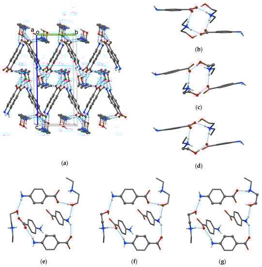 The crystal packing of HDEEA-pABA (Figure 3a) was based on seven heterosynthons between HDEEA cations and pABA anions: bicomponent R22(9) heterosynthon discussed above, three tetracomponent heterosynthons formed by two cations and two anions (Figure 3b–d) and three hexacomponent heterosynthons assembled by two cations and four anions (Figure 3e–g). The crystalline structure was additionally stabilized by fine C‒H∙∙∙O hydrogen bonds with the involvement of C(8) and C(13) as donors of H (Table 2).
