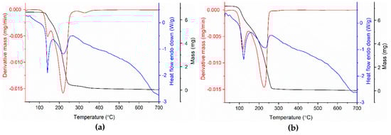 Thermo-analytical curves of HEEA-pABA (a) and HDEEA-pABA (b).