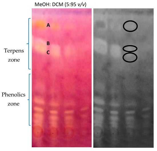 All TLC chromatograms were obtained on aluminum-covered normal phase TLC plates (Merck, Darmstadt, Germany, silica gel 60 F254). First, optimization studies on the composition of the mobile phase were performed to efficiently separate phenolic compounds from terpens on the thin layer. Finally the mixture of methanol and dichloromethane (5:95 v/v) was selected as the most effective one based on the derivatization with 1% sulfuric acid and UV visualization.