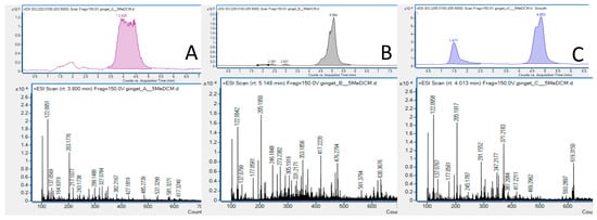 The identity of the three active zones (A, B, and C) present in the upper part of the TLC plate (terpene’s region, Figure 1) was successfully determined using a TLC-HPLC-MS approach. The volatile constituents were present in the documented mass spectra even when operating in the HPLC system, which means that they were successfully eluted out of the TLC-MS interface and a short chromatographic column by the mixture of water: acetonitrile (20:80 v/v) with the addition of 0.1% of formic acid. The analyzed mass chromatograms (Figure 2) showed significant homogenous peaks with distinct signals of ar-curcumene, α-sesquiphellandrene, and α-zingiberene. The identity of the last two compounds needed to be compared with the obtained GC-MS spectra, as both of them are characterized by the same molecular weight.