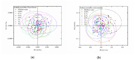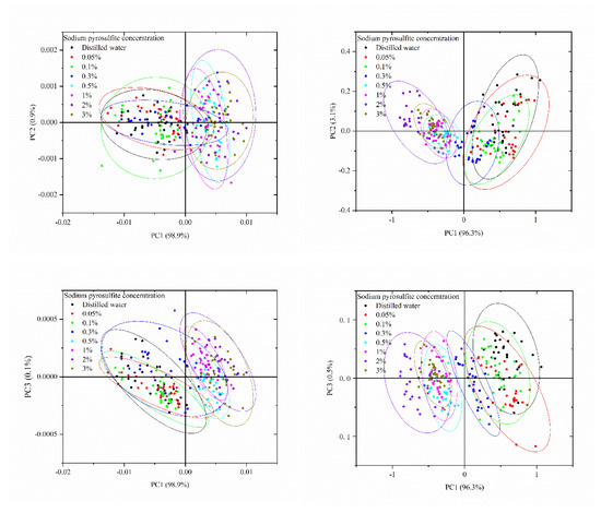 In this study, NIR spectra was used to analyze the sulfur dioxide residue on the surface of fresh-cut potato slices immersed in different concentrations of sodium pyrosulfite solution. It has been studied that the sulfite residue in tremella was detected by infrared spectroscopy, which showed that infrared spectroscopy was feasible for the sulfite residue in food [33]. At present, there were few studies on the detection of sulfur dioxide residues in food based on NIR spectra. In this study, we used a portable NIR spectrometer and a NIR-HSI system to acquire NIR spectra of the samples. Relevant research have shown that both imaging technique and non-imaging technique could be used to assess the quality of potatoes [22,34,35,36]. For the portable NIR spectrometer based on single-point acquisition information, it has the advantages of convenient sampling and low cost, but it was difficult to obtain comprehensive information. In the spectral acquisition process, several acquisition points of one sample were randomly selected. The spectral signal of the selected points were averaged to represent the sample as the object-wise pixel. It was difficult to ensure whether the collected signal point could represent the whole sample. The NIR-HSI system can provide spatial information of the sample while acquiring the spectral information. After obtaining the hyperspectral image, the pixel-wise spectra was extracted from each pixel of the region of one sample. The object-wise spectra and pixel-wise spectra were analyzed. Pixel-wise analysis and object-wise analysis were conducted [37]. The average of the pixel-wise spectra was calculated to represent the sample as the object-wise spectra. The spectra extracted by NIR-HSI system was more comprehensive and more representative of samples. For example, the spectral curve of samples in Figure 1b overlaps less than that in Figure 1a. Moreover, the pixel-wise spectra was used to form scores images of PCs combined with PCA. As shown in Figure 3, the differences among the samples and the differences among different positions of the same sample are intuitively displayed.