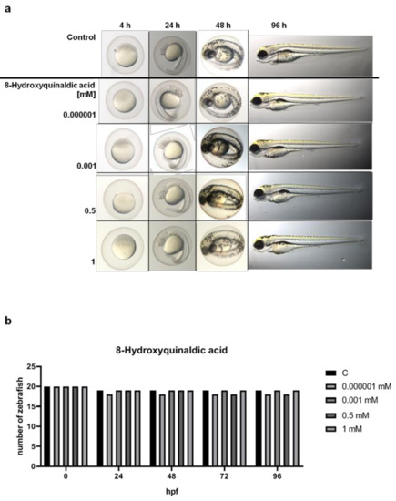 The effect of 8-hydroxyquinaldic acid on development (a) and viability (b) of zebrafish larvae. Fertilized zebrafish (AB line) eggs (n = 20) were exposed to E3 medium (control, C) or serial dilutions of 8-hydroxyquinaldic acid (0.000001; 0.001; 0.5, 1 mM) in E3 medium for 96 h. The medium was changed every 24 h. The microscopic observations were made in selected time points, i.e., 4, 24, 48, 72, 96 h.
