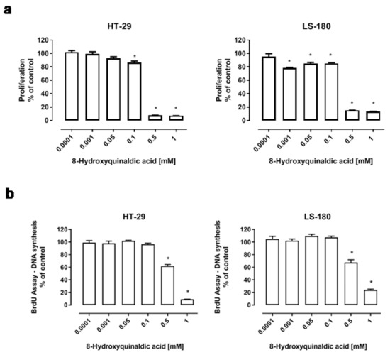 The effect of 8-hydroxyquinaldic acid on proliferation (a) and DNA synthesis (b) of human colon adenocarcinoma cells. HT-29 and LS-180 cells were exposed to culture medium (control) or serial dilutions of 8-hydroxyquinaldic acid (0.0001; 0.001; 0.05; 0.1; 0.5; 1 mM) in culture medium. The effect of tested compound on proliferation and metabolic activity of HT-29 and LS-180 cells was assessed by MTT assay after 96 h of incubation (a). The effect of 8-hydroxyquinaldic acid on DNA synthesis of HT-29 and LS-180 cells was assessed by BrdUassay after 48 h of incubation (b). Mean percentage values (% of control) ± SEM of six independent experiments (the mean value of control = 100%) are presented. Values were reported as statistically significant in comparison to the control at * p< 0.05 (one-way ANOVA with Tukey post hoc test).