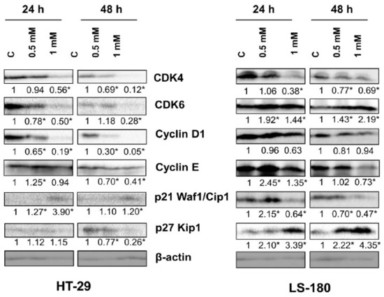 The effect of 8-hydroxyquinaldic acid on protein expression of selected cell cycle regulators in human colon adenocarcinoma cells. Western blot analysis of selected cell cycle regulators was performed after treatment of HT-29 and LS-180 cells with 8-hydroxyquinaldic acid (0.5, 1 mM) for 24 and 48 h (C control, not treated). Western blots shown in the figure were selected as the most representative of the series of repetitions n ≥ 3. The data were normalized to β-actin and calculated fold changes in protein expression marked (fold changes ≥ 0.20 were considered as significant [*]).