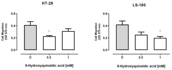 To verify whether 8-hydroxyquinaldic acid has any effect on the migration of colon cancer cells, the ability of HT-29 and LS-180 cells exposed to tested compound to invade the endothelial cell monolayer was analyzed by means of QCM™ tumor cell transendothelial migration assay. 8-Hydroxyquinaldic acid in the concentration of 0.5 mM, but not 1 mM, inhibited migration of HT-29 cells (Figure 6). Statistically significant inhibitory effect was also observed in LS-180 cells exposed to 8-hydroxyquinaldic acid (1 mM) (Figure 6).