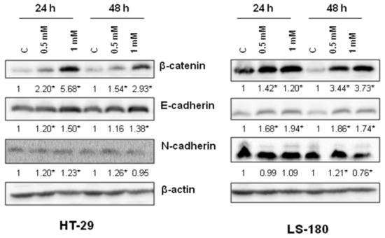 The effect of 8-hydroxyquinaldic acid on expression of β-catenin, E- and N-cadherin in human colon adenocarcinoma cells. Western blot analysis of expression of β-catenin and E- and N-cadherin was performed after 24 and 48 h treatment of HT-29 and LS-180 cells with 8-hydroxyquinaldic acid (0.5, 1 mM). Western blots presented above were selected as the most representative of the series of repetitions n ≥ 3. The data were normalized relative to β-actin and calculated fold changes in protein expression marked (fold changes ≥ 0.20 were considered as significant [*]).