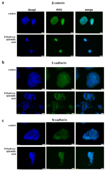 HT-29 cells cultured on LabTek Chamber Slides (Nunc, ThermoFisher Scientific, Roskilde, Denmark) were exposed to culture medium (control) or 1 mM 8-hydroxyquinaldic acid for 48 h in standard conditions. Then, cells were fixed with 3.7% paraformaldehyde, permeabilized with 0.2% Triton X-100, and treated with 5% bovine serum albumin (BSA, Sigma–Aldrich). The cells were exposed to primary antibodies against β-catenin and N- and E-cadherin (1:100; Cell Signaling Technology, Danvers, MA, USA) overnight at 4 °C and then were incubated with secondary antibody conjugated with fluorescein isothiocyanate (FITC)(1:100)(Sigma–Aldrich) for 2 h at room temperature. Cell nuclei were labeled with cell permeable fluorescent DNA dye DraQ5 (Cell Signaling Technology). Cell images were captured with fluorescence microscopy (automatic microscope Olympus IX83; Olympus Optical Co., Ltd., Tokyo, Japan, and CellFamilyAnalySIS software) at 40× magnification.