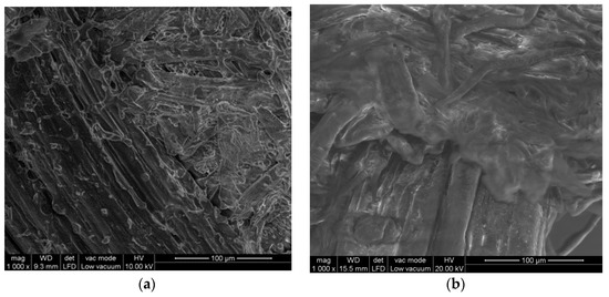 In the respective images obtained from the IB fractures, presented in Figure 1, clear differences appear between the boards with and without a final heat treatment. If we look at the micrographs of the untreated boards, they show a more fibrous appearance. Lignin droplets are not observed. On the other hand, the boards with heat treatment clearly show the molten lignin. The plane of fracture in measuring the IB was produced fundamentally by the rupture of the lignin, providing a much higher IB value.