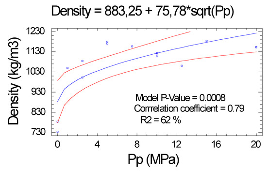 The analysis of regression and variance shows us the relationship between Pp and density, with a correlation coefficient of 0.79, see Figure 2. The proportion of variability of the density values explained by the exposed function was comparatively low (R2 = 62%), compared to the explained variability of other characteristics, which is much higher.