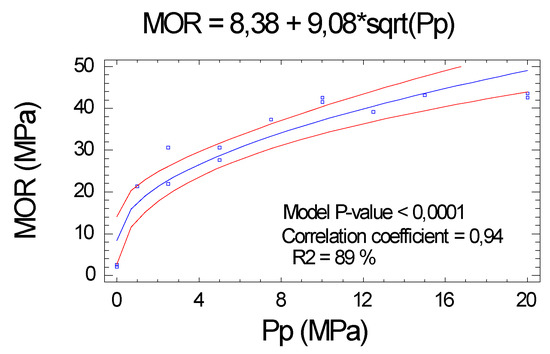 As in the case of the MOE, the MOR had a very high correlation with the Pp applied to each board and explains the variability of the MOR of the boards (correlation coefficient of 0.94 and R2 = 88.7%), including a high level of significance (p value < 0.01), both for the ordinate, slope, and model as a whole, see Figure 4.