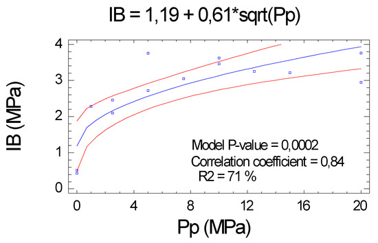 IB also had a high correlation with Pp, and its variability is mostly explained by the proposed function (correlation coefficient of 0.84 and R2 = 71.1 %). The level of significance was slightly lower than those obtained for the MOE and MOR, but still remained very high (p value <0.01), see Figure 5.