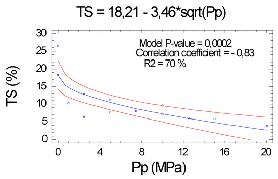 As with the TS, the WA confirmed the negative relationship with the Pp. The correlation obtained between Pp and WA was important (correlation coefficient of −0.8), and the R2 was average (63.4%), all with a high level of significance (p value < 0.0001), see Figure 7.