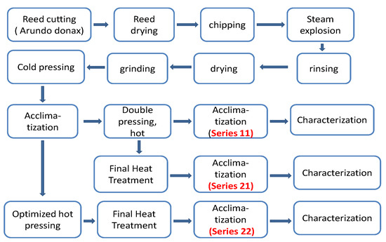 The initial production phase consisted of a hydrolytic steam explosion treatment followed by the sequence: washing, drying, crushing, cold pressing, and conditioning of the moisture of the material in a climatic chamber. From this point onwards, the following series of experiments were designed (see Figure 1).
