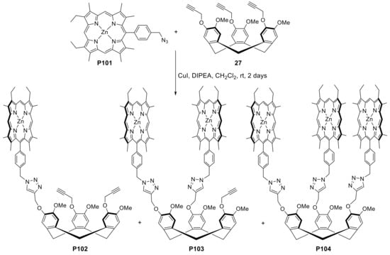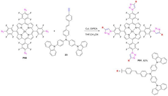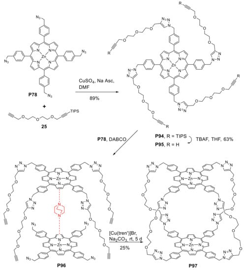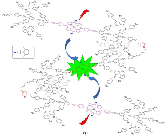 Kozaki and co-workers reported the synthesis of a trimeric assembly of dendritic porphyrins with two kinds of porphyrin cores [28]. Compound P21 (Figure 1) was prepared using a CuAAC reaction between a dendrimer having a Zn(II) diethynyldiphenylporphyrin core with two azide terminals and two equivalents of a dendrimer having a Zn(II) tetraphenylporphyrin core with one ethynyl terminal. This reaction was performed using copper sulfate (10 equiv.) and sodium ascorbate (45 equiv.) in dry DMF at room temperature for two days to afford trimer P21 as a black solid at a 66% yield. Absorption and fluorescence studies revealed that trimer P21 has a solvent-dependent conformation; while extended forms are favored in 1,1,2,2-tetrachloroethane (polar), the folded conformation is predominant in toluene (nonpolar). These different conformations explain why the singlet energy transfer from the tetraphenylporphyrins to the central diphenylporphyrin takes place with higher quantum efficiency in toluene than in 1,1,2,2-tetrachloroethane.