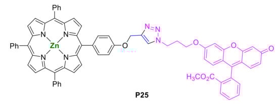 Leroy-Lhez and co-workers followed a similar synthetic approach to attach a fluorescein-azide moiety to a porphyrin macrocycle bearing a propargyl moiety. The reaction was carried out under CuAAC conditions, affording the porphyrin–fluorescein dyad P25 at a 91% yield (Figure 2). Photophysical studies supported by density functional theory (DFT) calculations showed strong evidence of efficient energy transfer (~40%) between the porphyrin and fluorescein moieties [30].