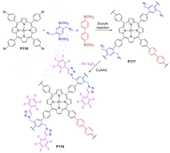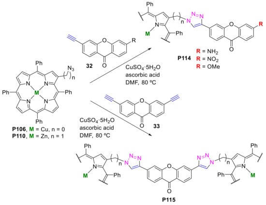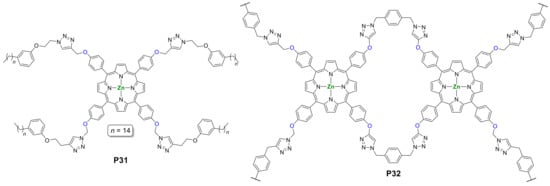 Ye and co-workers prepared porphyrin-based porous polymers by the reaction of porphyrin P26 with 1,4-bis(azidomethyl)benzene via CuAAC reaction in the presence of N,N´,N′,N″,N″-pentamethyl-diethylenetriamine (PMEDTA) and CuBr in DMF at 100 °C for 48 h. The obtained porous Zn(II) porphyrin polymer P32 (Figure 3) is able to interact and to act as protein adsorbent, showing potentiality for protein immobilization and other applications in pharmaceutical or food industries [35].