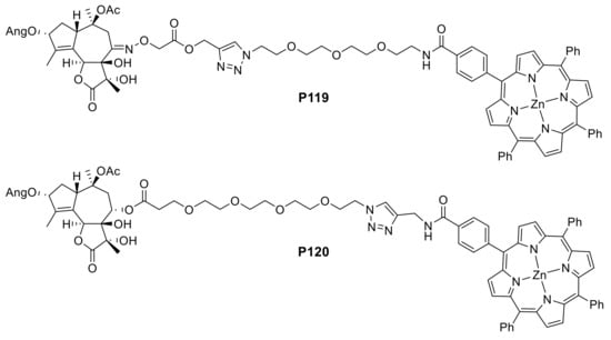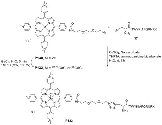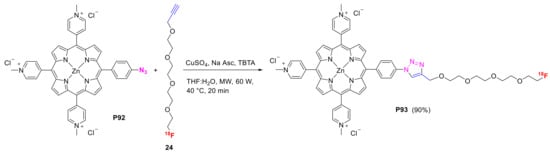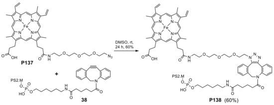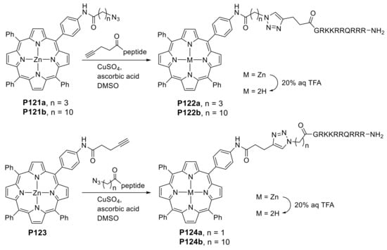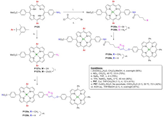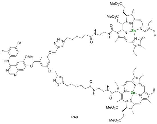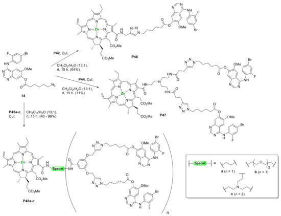 The same group described the synthesis of the bis(chlorin)-quinazoline derivative P49 (Figure 4, 57%) by reaction of the chlorin-azide derivative, prepared by reaction of chlorin P43a with 6-azidohexanoic acid, and a quinazoline di-alkyne derivative in the presence of catalytic amounts of CuI in a DMF/water (40:1) mixture [38].