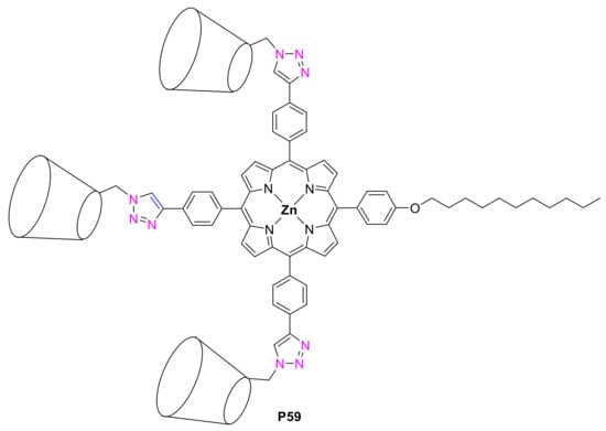 The CuAAC approach also allowed the efficient preparation (90% yield) of other amphiphilic porphyrin conjugates such as the porphyrin-cyclodextrin conjugate P59 (Figure 5) [43]. The conjugation between the 6-deoxy-6-azidopermethyl-β-cyclodextrin and the meso-tris(ethynylphenyl)porphyrin derivative was performed in THF under stirring in the presence of copper(II) sulfate and sodium ascorbate in water for 48 h at 60 °C under an argon atmosphere. The obtained amphiphilic porphyrin-cyclodextrin conjugate P59 was used to prepare supramolecular nanoarchitectures to control drug delivery.