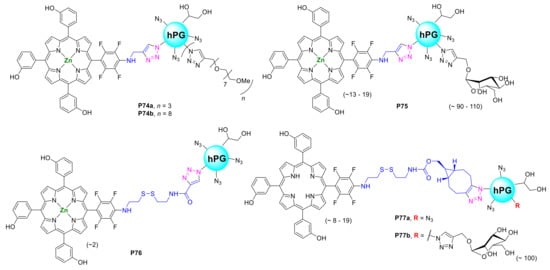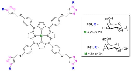 Drain and co-workers also reported the synthesis of several porphyrin derivatives bearing carbohydrate moieties [44]. These authors prepared carbon-1 and carbon-3-galactosyl porphyrin conjugates P60 and P61 (M = 2H or Zn) under CuAAC conditions and tested them towards four tumoral cell lines (monolayers or spheroids) containing high expression of galactin-1 protein (Figure 6). The results pointed out that the uptake of the cabon-3 galactose porphyrin derivatives (P61) is higher than the carbon-1 galactose porphyrin derivatives (P60) probably due to the higher hydrophilicity and the binding recognition domain of galectin-1 protein by the available hydroxyl group at carbon-1 [44].