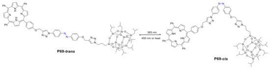 - Zhang, Y.; Yue, T.; Cao, H.; Gao, Y.; Zhang, W. Photocontrollable Supramolecular Self-Assembly of a Porphyrin Derivative that Contains a Polyhedral Oligomeric Silsesquioxane (POSS). Asian J. Org. Chem. 2017, 6, 1034–1042. [Google Scholar] [CrossRef]