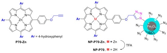 - Hollingsworth, J.V.; Bhupathiraju, N.V.S.D.K.; Sun, J.; Lochner, E.; Vicente, M.G.H.; Russo, P.S. Preparation of Metalloporphyrin-Bound Superparamagnetic Silica Particles via “Click” Reaction. ACS Appl. Mater. Interfaces 2016, 8, 792–801. [Google Scholar] [CrossRef]