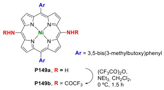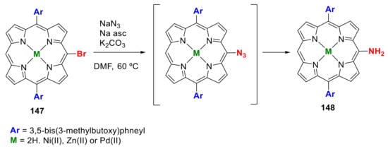 - Yamashita, K.-i.; Kataoka, K.; Takeuchi, S.; Sugiura, K.-i. Metal-Free Synthesis of meso-Aminoporphyrins through Reduction of meso-Azidoporphyrins Generated in Situ by Nucleophilic Substitution Reactions of meso-Bromoporphyrins. J. Org. Chem. 2016, 81, 11176–11184. [Google Scholar] [CrossRef]