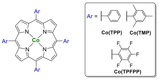- Singh, R.; Mukherjee, A. Metalloporphyrin Catalyzed C–H Amination. ACS Catal. 2019, 9, 3604–3617. [Google Scholar] [CrossRef]