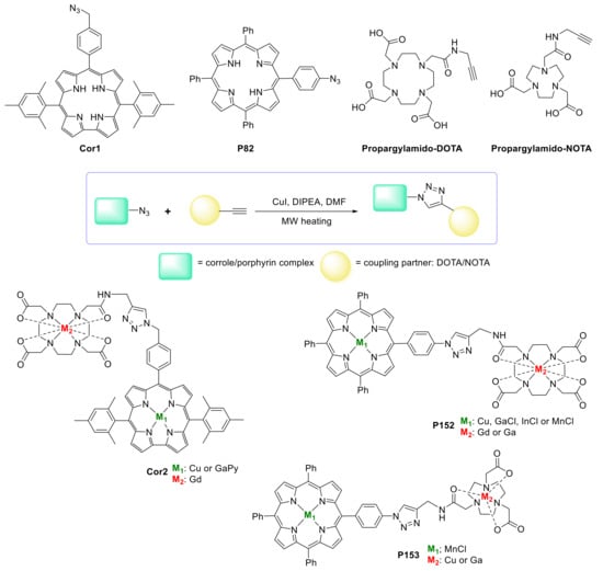 - Desbois, N.; Pacquelet, S.; Dubois, A.; Michelin, C.; Gros, C.P. Easy access to heterobimetallic complexes for medical imaging applications via microwave-enhanced cycloaddition. Beilstein J. Org. Chem. 2015, 11, 2202–2208. [Google Scholar] [CrossRef] [PubMed]