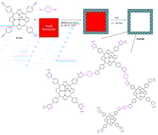 The iron(III) complex of 5,10,15,20-tetrakis(4-ethynylphenyl)porphyrin (P1-Fe) was used by Son and co-workers to prepare hollow microporous porphyrinic-based organic networks [18]. The authors used Cu2O nanocubes as templates and networking catalysts, and a click-chemistry approach. This reaction involved the addition of P1-Fe and 1,4-diazidobenzene to a suspension of Cu2O nanocubes in a DMSO/H2O mixture. The reaction mixture was heated for 20 h at 85 °C leading to the formation of the microporous Fe(III) porphyrin network on the surface of the Cu2O nanocubes. The Cu2O core was removed by acid treatment and the Fe(III) porphyrin network linked by bis-triazolylbenzene bridges (Scheme 1) was obtained. The Fe(III) porphyrin-based organic network (FePON) prepared was explored as a catalyst for carbene insertion into N-H bonds; the obtained results revealed excellent catalytic activity, selectivity and recyclability [18].