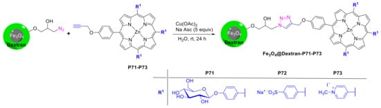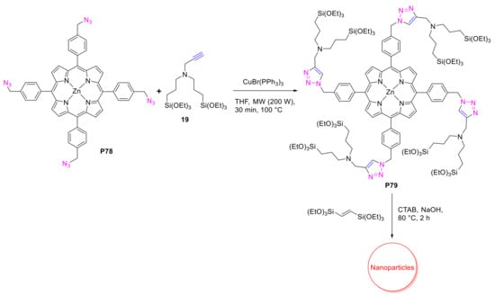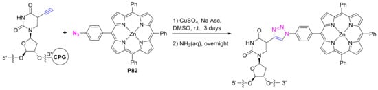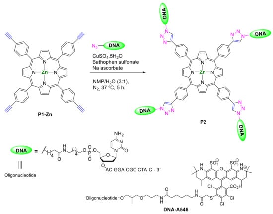 Wang and co-workers reported the reaction of the Zn(II) complex of 5,10,15,20-tetrakis(4-ethynylphenyl)porphyrin P1-Zn with 5´-azide terminated DNA oligonucleotide (Scheme 2) [19]. The reaction was performed under classical CuAAC conditions, in the presence of bathophenanthroline sulfonate as a Cu(I) stabilizing ligand, yielding a mixture of the corresponding porphyrin adducts containing one, two (cis and trans), three and four (P2 in Scheme 2) triazolyl-DNA oligonucleotides.