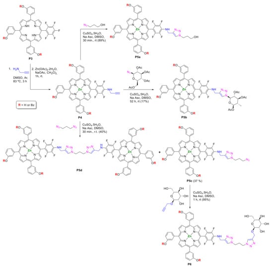 The nucleophilic substitution of the para fluorine atom at the pentafluorophenyl ring in porphyrin P3 by propargylamine afforded the alkynyl A3B porphyrin P4 that showed to be a useful platform for further functionalization at the meso-substituents of the macrocycle via CuAAC reactions (Scheme 3). Using that strategy, Wiehe and co-workers prepared a set of porphyrin-triazole derivatives P5a–d containing several functions such as hydroxyl, mannosyl and azido groups, respectively P5a, P5b and P5c, and the porphyrinic dimeric species P5d. Macrocycle P5c was further modified with propargyl α-d-mannopyranoside affording derivative P6 at a 95% yield (Scheme 3) [20].