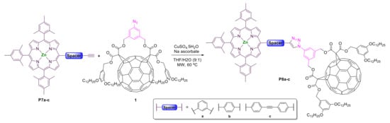The access to porphyrin–fullerene dyads prepared by a CuAAC reaction using a fullerene functionalized with an azido group directly attached to the central bridging subunit was reported by Nierengarten and co-workers [21]. The reaction of the alkynylated Zn(II) porphyrins P7a–c bearing conjugated spacers (m-phenylene, p-phenylene, di-p-phenylene-ethynylene) with the azide moiety 1 was achieved under microwave irradiation (MW) at 60 °C and using CuSO4·5H2O and sodium ascorbate in a THF/H2O mixture (Scheme 4). Compounds P8a–c were obtained in moderate yields after 3 h (Scheme 4). The authors highlighted that when the reactions were performed at room temperature or under classical heating conditions a slow consumption of the starting material was observed and the desired compounds were obtained in low yields, this being due to the degradation of compound 1. Compounds 8a,b have shown relatively fast, efficient and long-lived photoinduced electron transfer (PET).