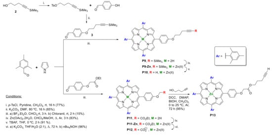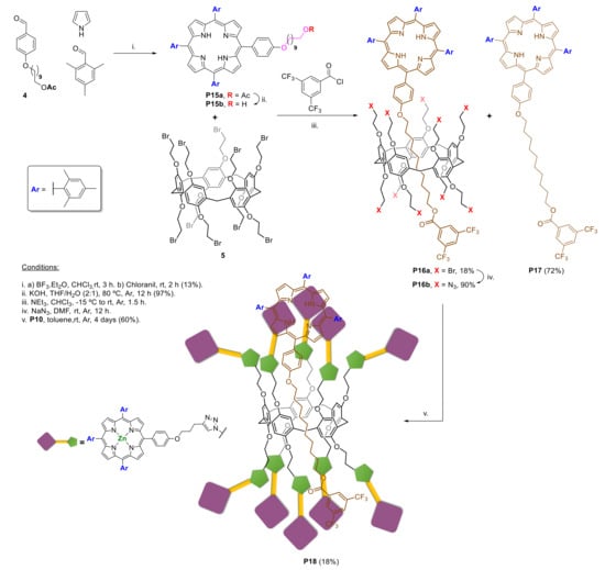 Nierengarten and co-workers also developed a synthetic approach to prepare pillar[5]arene derivatives peripherally decorated with porphyrin units [24]. The synthetic route started by the preparation of the alkyne-substituted A3B-type porphyrin derivatives P10 and P13 (Scheme 5). The preparation of the Zn(II) porphyrin-alkyne complexes began with the preparation of the aldehyde 3 by tosylation of 5-(trimethylsilyl)pent-4-yn-1-ol 2 followed the Williamson etherification of the tosylate with 4-hydroxybenzaldehyde affording 3 in an 85% yield. The next step involved the condensation of pyrrole, mesitaldehyde and 3 in the presence of catalytic amounts of BF3.Et2O under the conditions described by Lindsey [25]. The porphyrinic core P9 was metalated with Zn(II) and the obtained product was reacted with tetrabutylammonium fluoride (TBAF) in THF to give the porphyrin derivative P10 with a terminal alkyne moiety (Scheme 5) [24].
