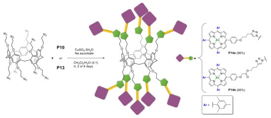 A similar strategy was used to prepare the Zn(II) porphyrin-alkyne complex P11-Zn. The latter derivative, by basic hydrolysis and tetrabutylammonium hydroxide treatment, gave rise to the corresponding carboxylate P12 as its tetrabutylammonium salt. Esterification of P12 with pent-4-yn-1-ol under classical peptide conditions with N,N’-dicyclohexylcarbodiimide (DCC), 4-(dimethylamino)pyridine (DMAP), and 1-hydroxybenzotriazole (HOBt) afforded the Zn(II) porphyrin complex P13 (Scheme 5) [24]. The Zn(II) porphyrin-alkyne complexes P10 and P13 were grafted to azido pillar[5]arene building blocks via CuAAC reaction, affording the ten porphyrin-triazole rings P14a and P14b in 96% and 66% yield, respectively (Scheme 6).