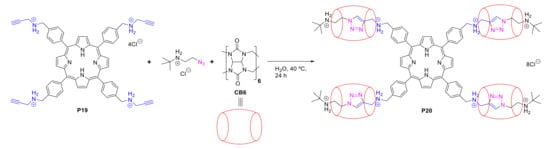 More recently, Tuncel and co-workers reported the synthesis of a cucurbit[6]uril (CB6) [5]rotaxane P20 bearing a tetracationic porphyrin decorated with triazole units [27]. The [5]rotaxane P20 was synthesized as depicted in Scheme 8; the tetracationic porphyrin derivative P19 was reacted with tert-butyl azidoethylammonium chloride and CB6 in water for 24 h at 40 °C (Scheme 8). In this reaction the CB6 has a dual function; it is the catalyst for the 1,3-dipolar cycloaddition between the azido and the alkynyl groups, leading to the formation of the 1,2,3-triazole ring, and it is the macrocycle for the inclusion of the four triazole rings. The porphyrin-core [5]rotaxane P20 was obtained at an 87% yield [27].