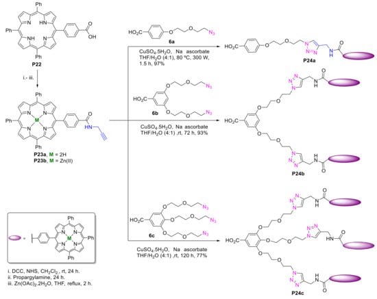 Acherar and co-workers reported the preparation of porphyrin-based building blocks using a click chemistry synthetic strategy [29]. The authors started by the preparation of Zn(II) porphyrin complex P23b (Scheme 9). For that the 5-(4-carboxyphenyl)-10,15,20-triphenylporphyrin P22 was converted into the propargyl-amide derivative P23a (96% yield) by reaction with an excess of propargylamine after the in situ activation of the carboxyl group of P22 with DCC and NHS. Compound P23a was metalated with the Zn(II) ion affording derivative P23b in quantitative yield. The reaction of porphyrin P23b and the mono-, di- and tri-substituted azides 6a–c was carried out in the presence of catalytic amounts of CuSO4 and sodium ascorbate, 0.1 and 0.5 equiv., respectively. During the optimization of the reactional conditions the authors observed that for compound P24a the better conditions involved microwave (MW) irradiation. For compounds P24b,c the best conditions involved stirring at rt for three to five days. The described conditions allowed to obtain derivatives P24a–c in yields ranging from 77% to 97%. Photophysical studies with P24a–c carried out by the same group have revealed that the number of porphyrin units influences their photophysical properties [29].