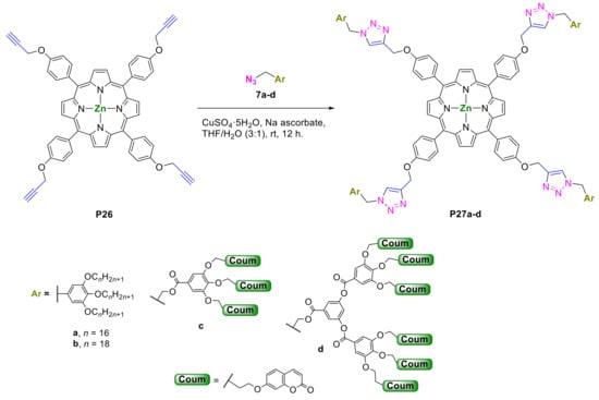 Serrano and co-workers prepared porphyrin-core dendrimer derivatives P27c,d with three or six alkyl chains with a terminal coumarin moiety at each one of the meso positions. These compounds were synthesized by a CuAAC reaction between porphyrin-alkyne P26 and the appropriate azido dendrons derivatives 7c,d [32]. The tetra-substituted porphyrin-based functionalized P27c and second-generation dendrimers P27d were isolated in 91% and 71% yields, respectively, and their liquid crystalline behavior explored (Scheme 10). The two derivatives displayed mesogenic properties and the authors found that the coumarin moieties play a key role for the liquid crystal performance with a high contribution to the discotic nematic mesophases showing high hole mobility values when compared with an analogous derivative peripherally functionalized with dodecyloxy alkyl chains. Additionally, the coumarin moieties have an antenna effect, inducing an energy transfer process after excitation, presenting appropriate features to be used in optoelectronic applications [32].