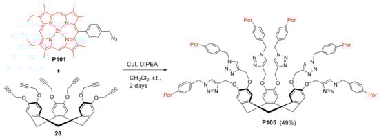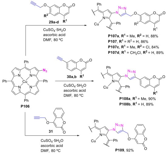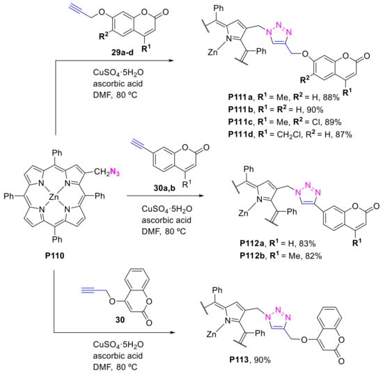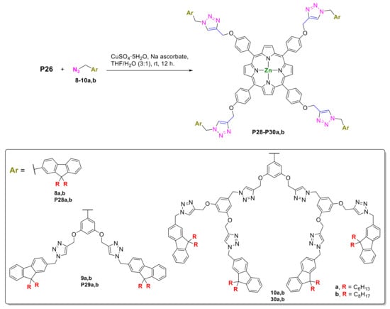 Rajakumar described the preparation of porphyrin-based triazole—bridged fluorenodendrimers P28a,b, P29a,b and P30a,b [33]. The porphyrin-fluorenodendrimers conjugates P28–P30a,b were prepared by reaction of the porphyrin-propargyl derivative P26 with a series of dialkyl-fluorene azido dendrons 8–10a,b through a CuAAC reaction. The reaction was carried out in the presence of CuSO4·5H2O (5 mol%) and sodium ascorbate (10 mol%) in a mixture of THF/H2O (3:1) for 12 h at room temperature. Compounds P28–P30a,b were isolated in yields ranging from 71% to 82% (Scheme 11).